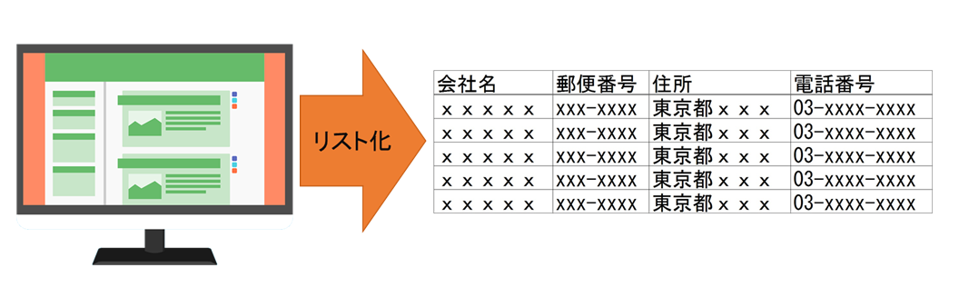 お客様ご指定のホームページから住所、電話番号、会社名(店舗名)等を一括で取得します。